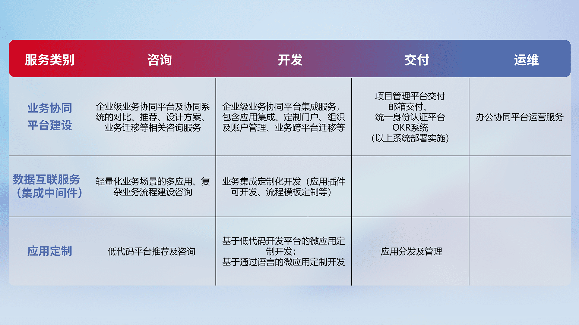 针对钉钉、、、、企微、、、IDaas等平台级产品提供产品的规划、、、、方案、、、、交付、、、、定制化开发等服务,,实现如统一协同办公、、智能客户服务、、、、混合会议管理、、、智能数据查询、、、、等业务场景,,,实现数字化转型。。。。